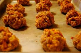 - Roll into little balls, bake for about 20 minutes...they should be sort of orangey colored (cheese) and slightly doughy on the inside.